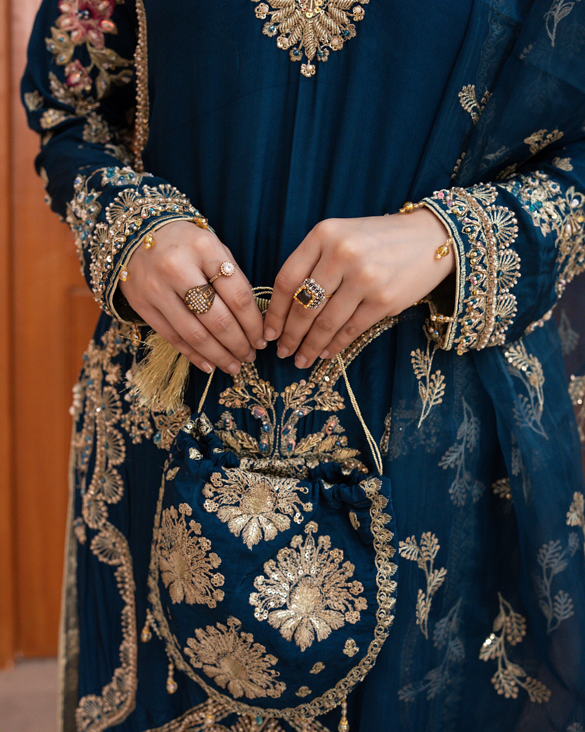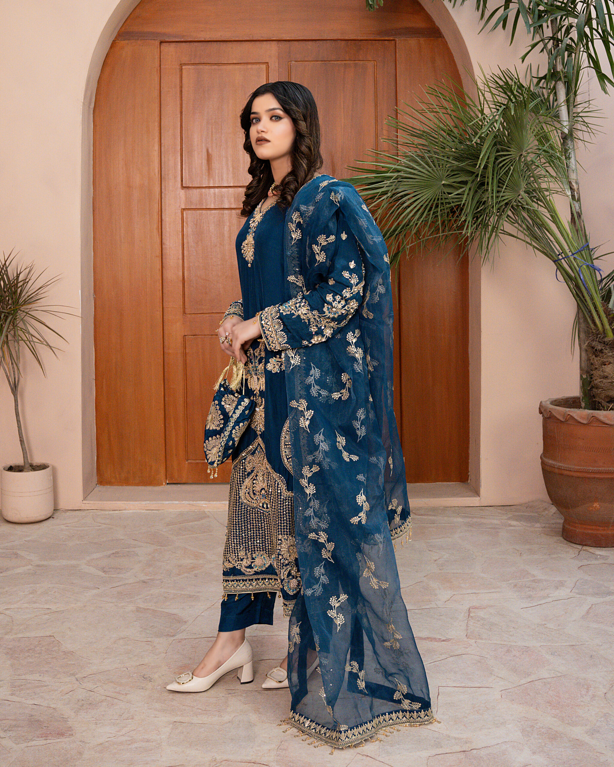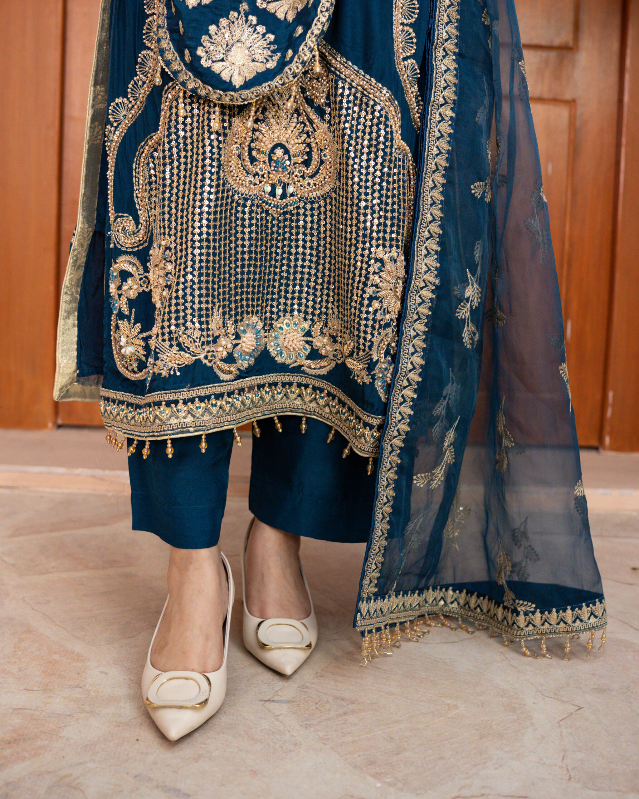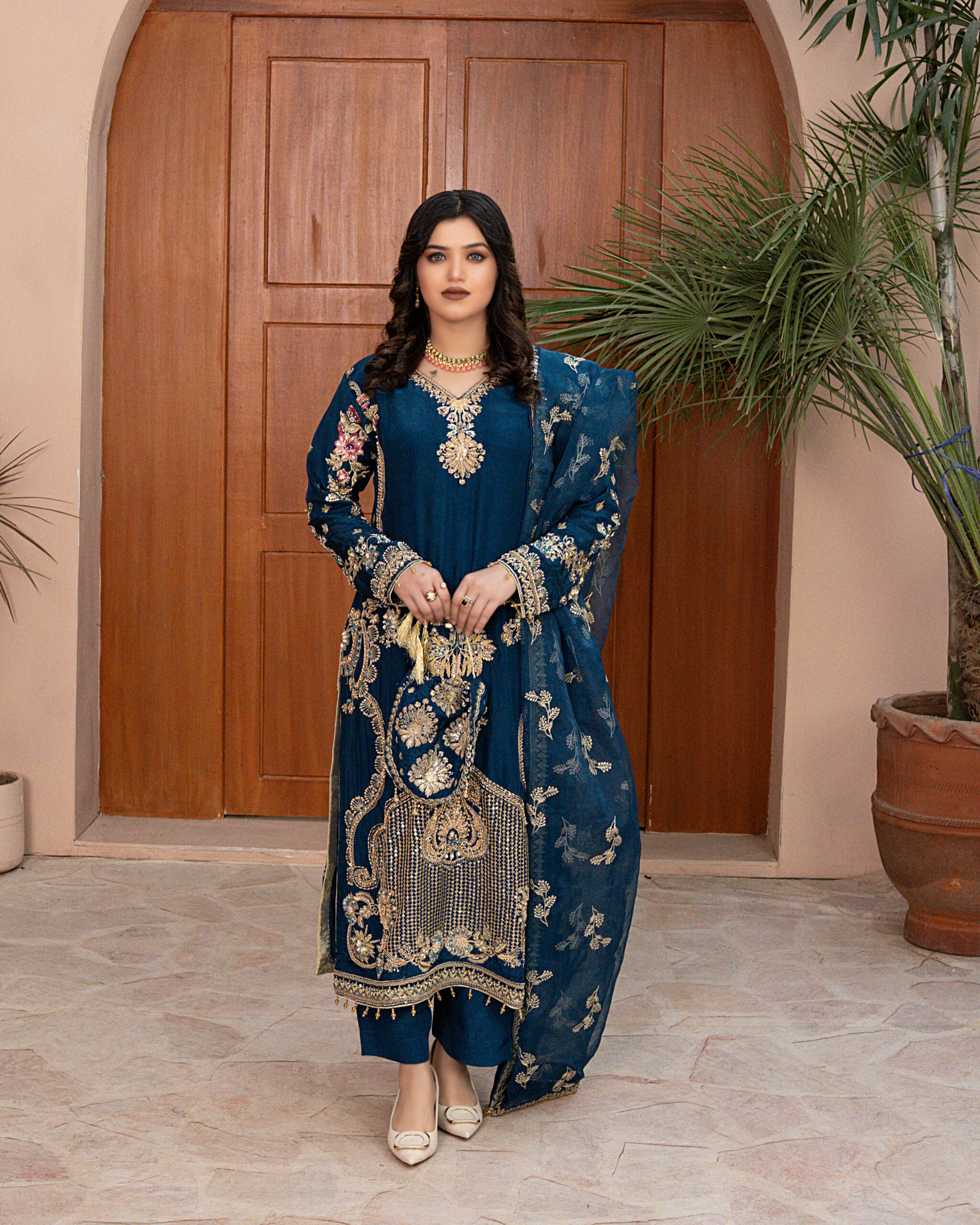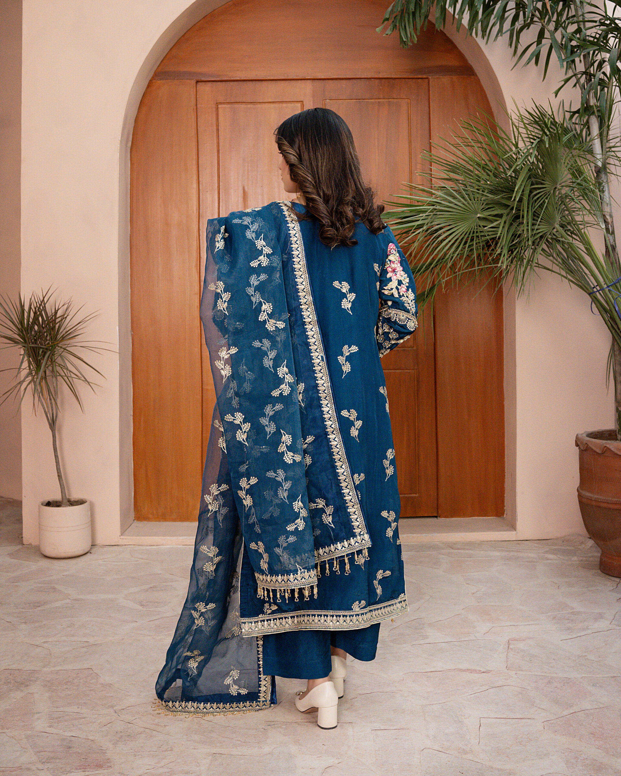 Azure is a refined formal ensemble crafted in premium raw silk, featuring intricate embroidery and delicate hand embellishments. Designed in a rich blue tone, this outfit offers a graceful silhouette that makes it ideal for weddings, festive gatherings, and formal occasions.