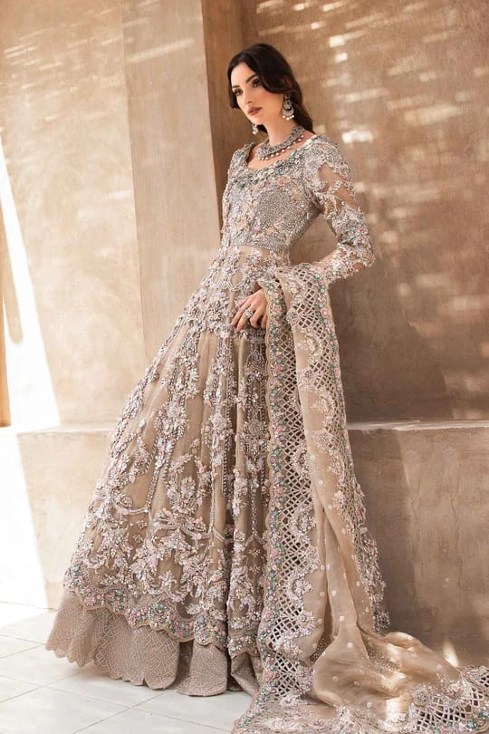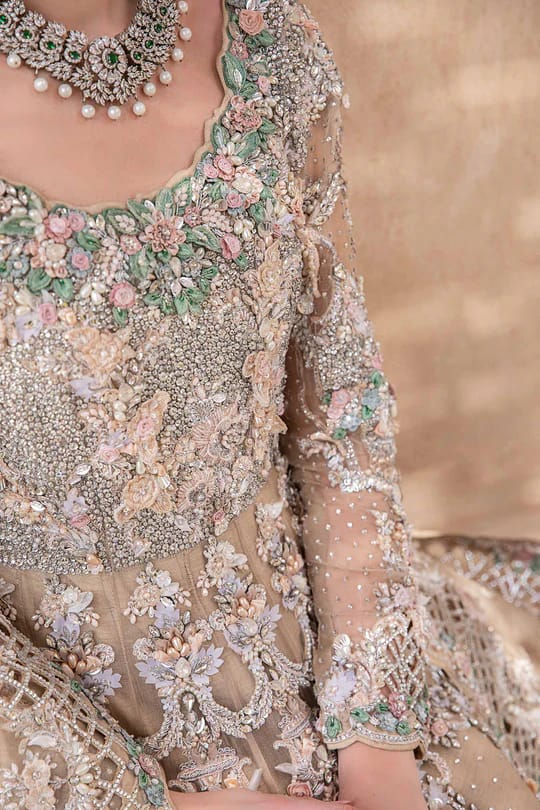 LUNARA is a stunning nude peach organza gown with intricate embroidery, featuring ribbons, diamonds, sequins, pearls, crystals, and fine dabka and naqshi work. Designed to radiate confidence and grace.