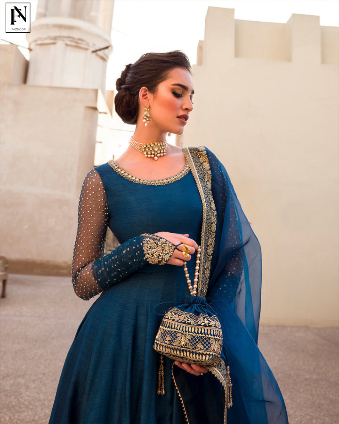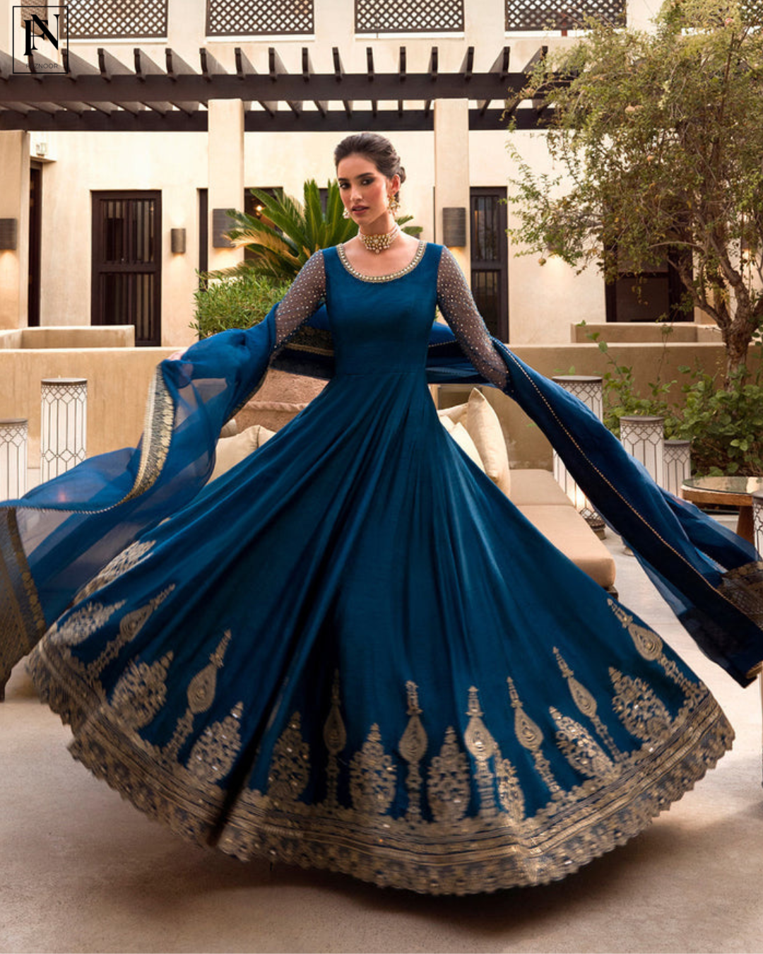 Risma is the classic peshwas reimagined in a soulful symphony of tilla, crystal, sequin, kora and naqshi on Korean raw silk. This ensemble comes with the evergreen churidar and a billowy organza dupatta to culminate in a statuesque silhouette that is guaranteed to make heads turn.
