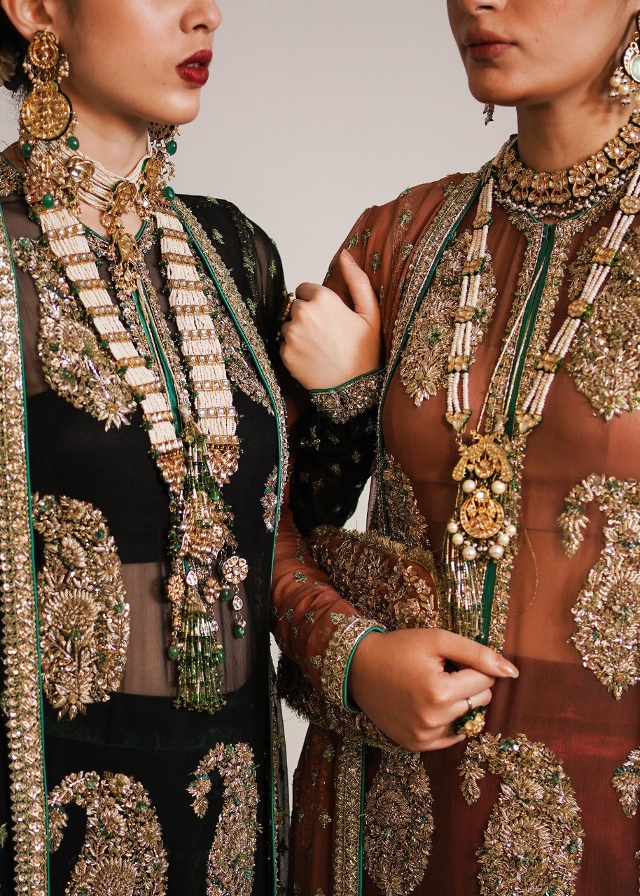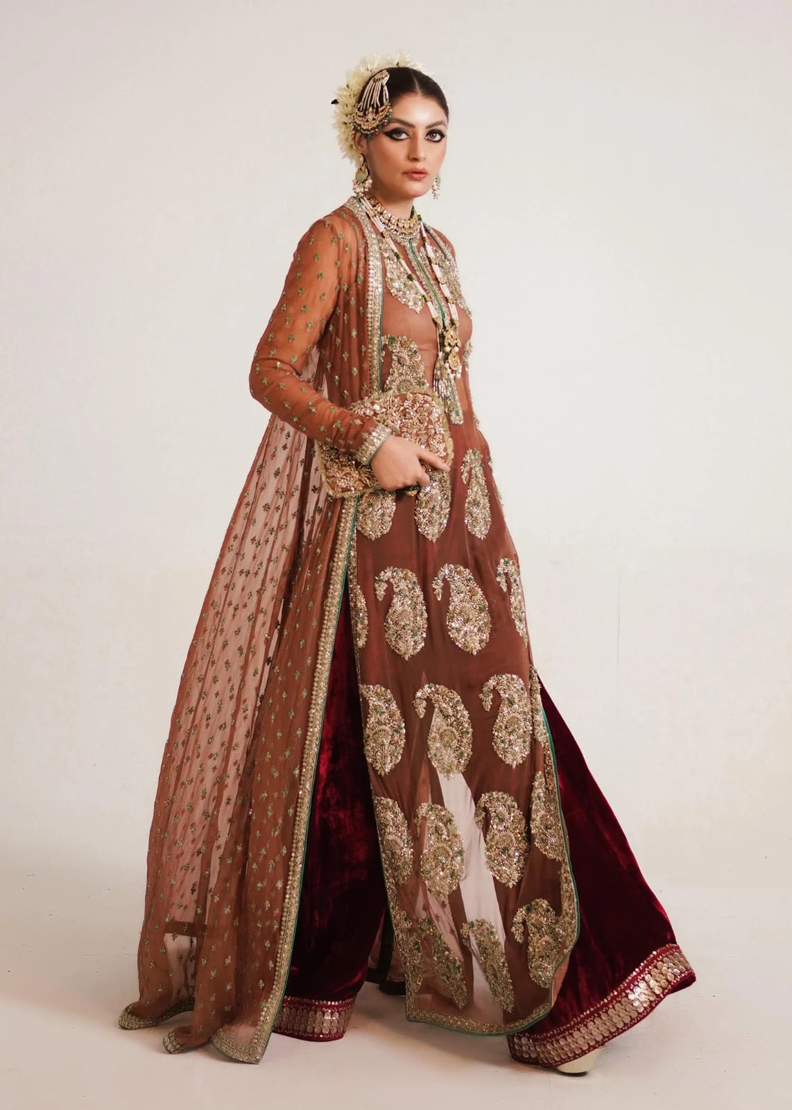 This stunning outfit features a rust-brown chiffon shirt that flows gracefully to the floor, intricately detailed with gold naqshi, dabka, sequins, and vibrant cutdana work. The design is paired with a delicate chiffon gown, which is further enhanced with light sequin embellishments on the chatta, giving the entire piece an elegant shimmer. The look is completed with a satin silk bustier for a sleek fit and velvet palazzo pants, finished with a refined lappa at the hem for added sophistication.