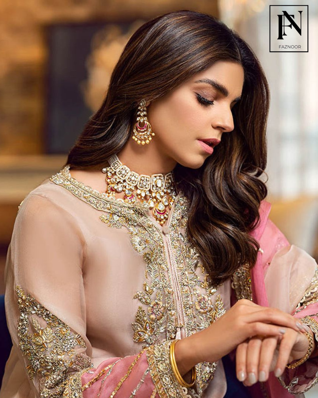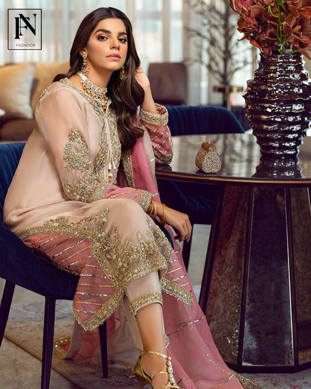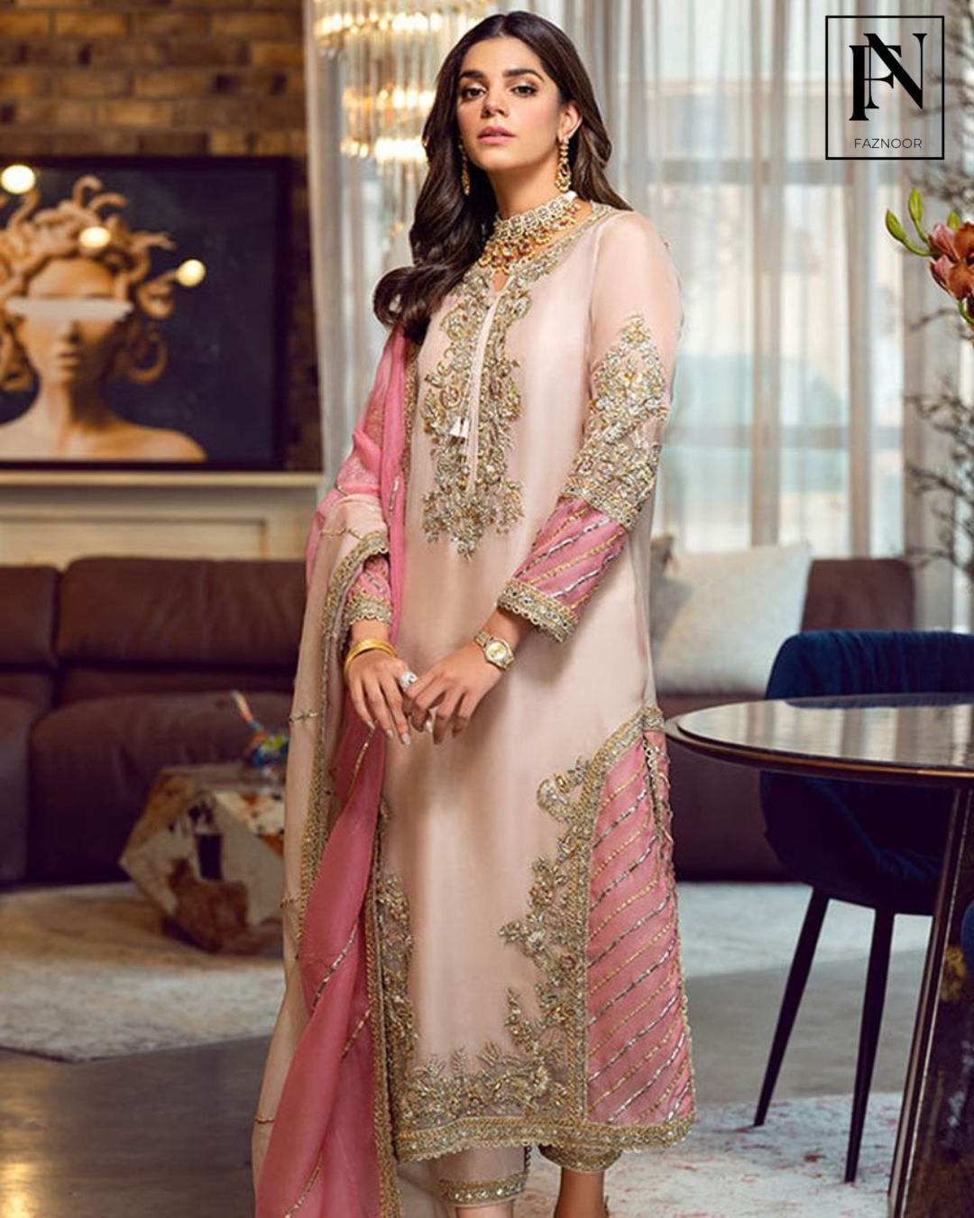 A classic long shirt adorned with sparking beads, zardozi and mukesh sewed in patterns and motives laden aestbically over the sorbet peach shirt and pants. It is accentuated with rose pink panels and duppata lined with Mukesh completing the ethereal look.